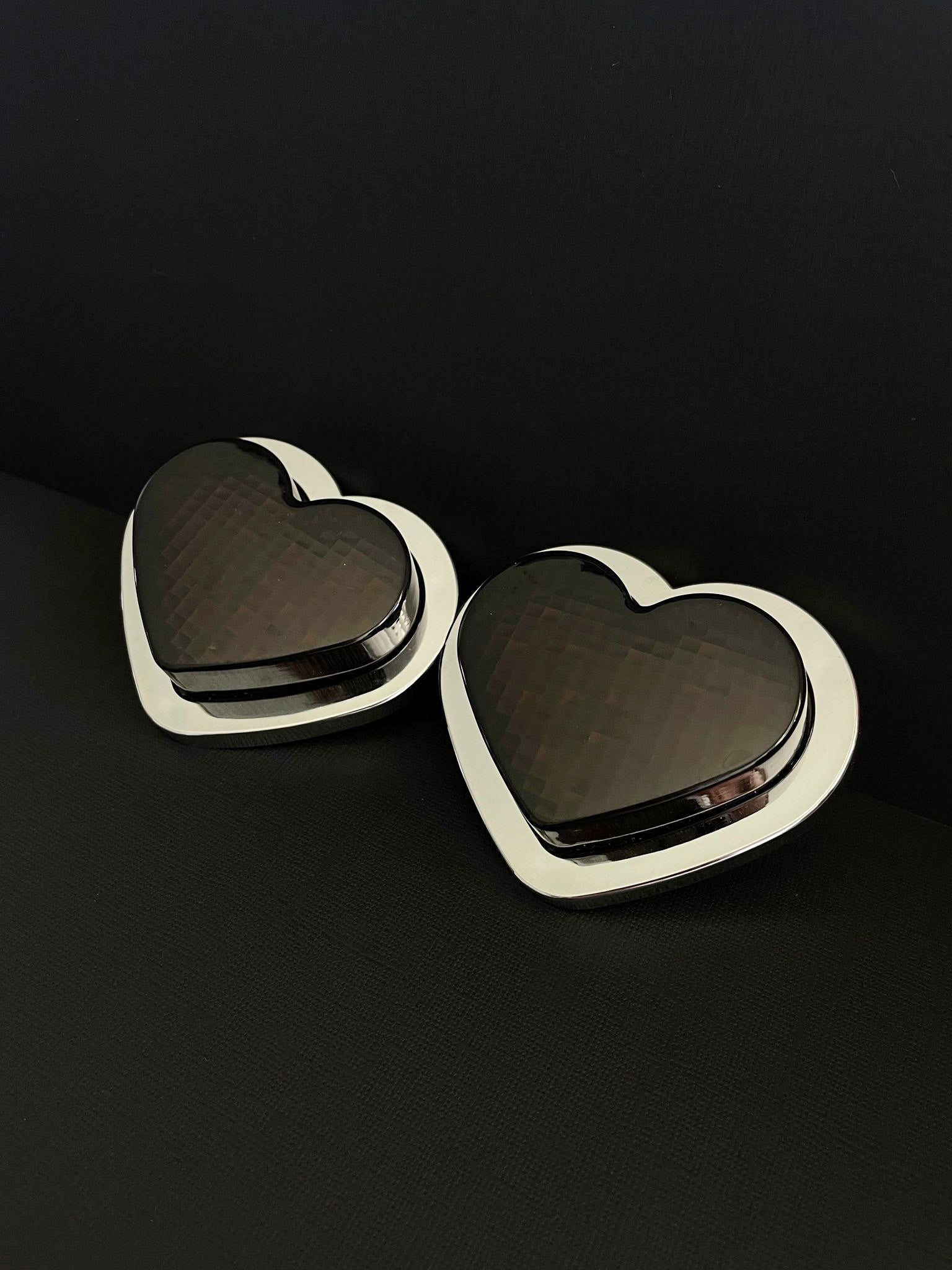 Pair of Universal heart shaped 12v side indicators. Black tint finish with a silver surround. Indicators flash white
