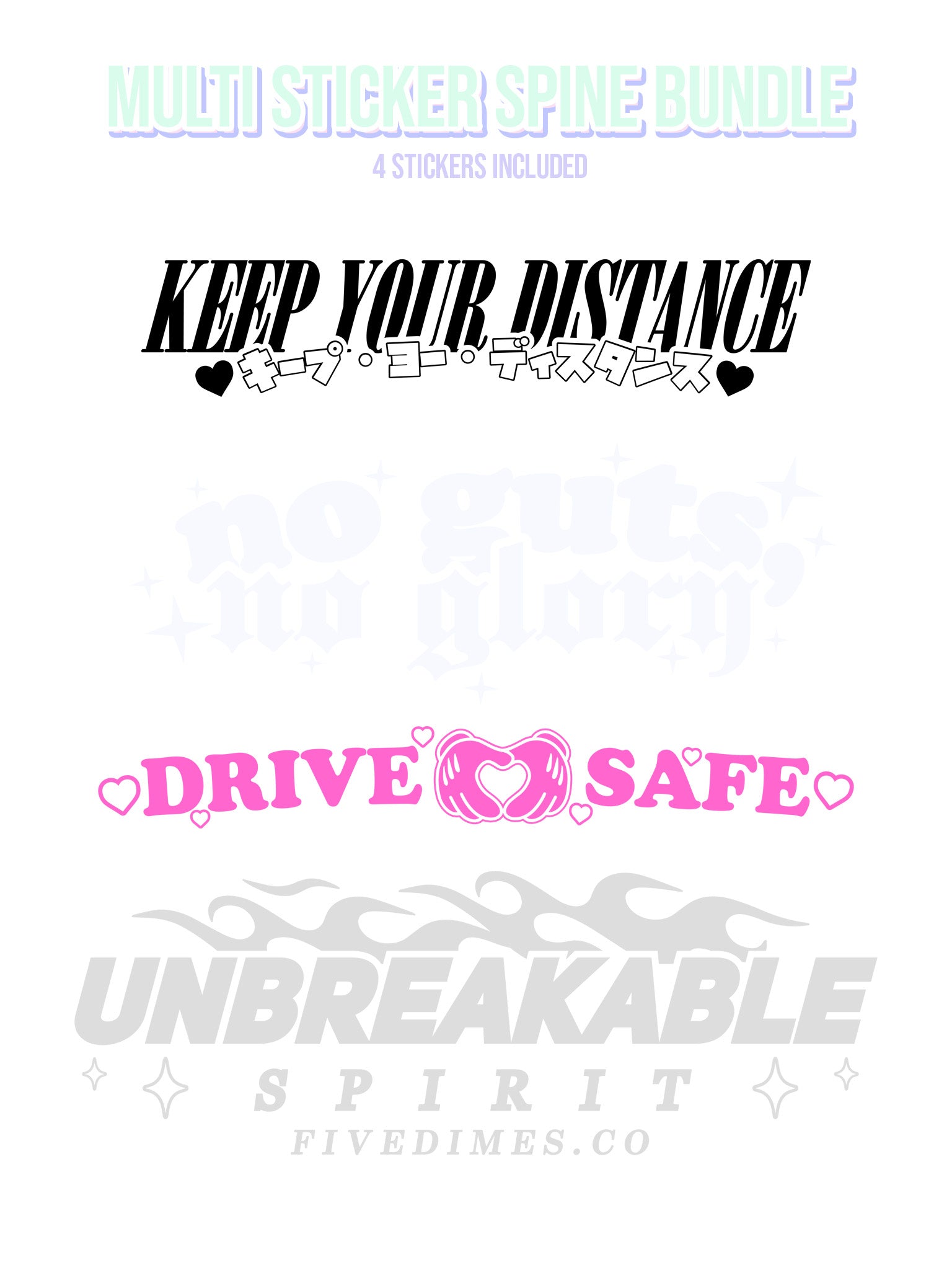 - Keep Your Distance (Black Chrome), No Guts No Glory (Chrome Pearl), Drive Safe (Hot Pink Chrome), Unbreakable Spirit (Silver Chrome) DieCuts