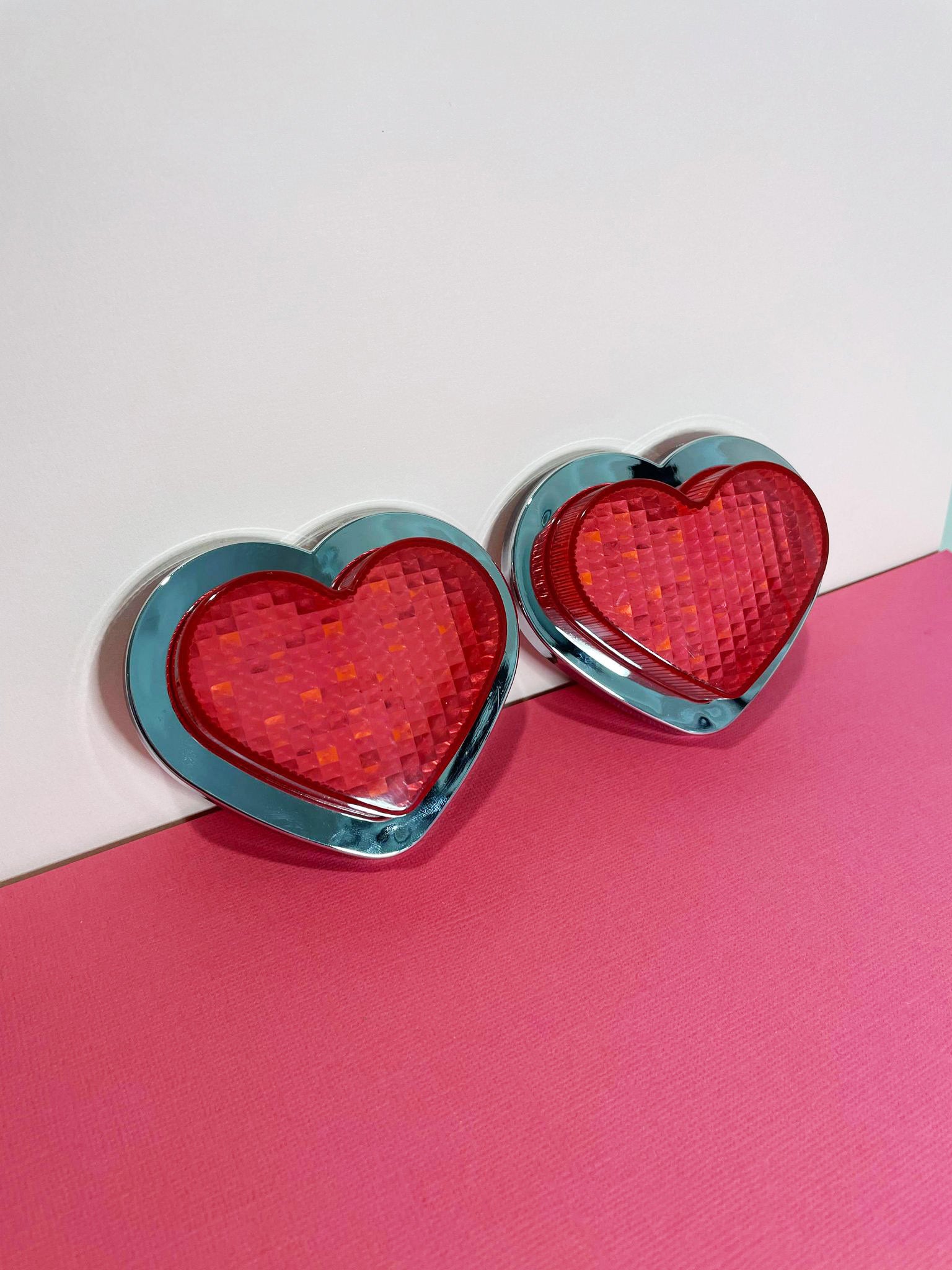 Pair of Universal heart shaped 12v side indicators. Stained pink finish with a silver surround.